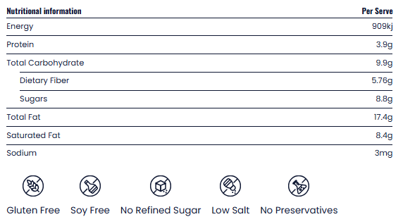ALMONDS, Dates, Organic Coconut, Organic Rice Malt Syrup, Organic Coconut Oil, Chicory Root (Prebiotic Fibre)