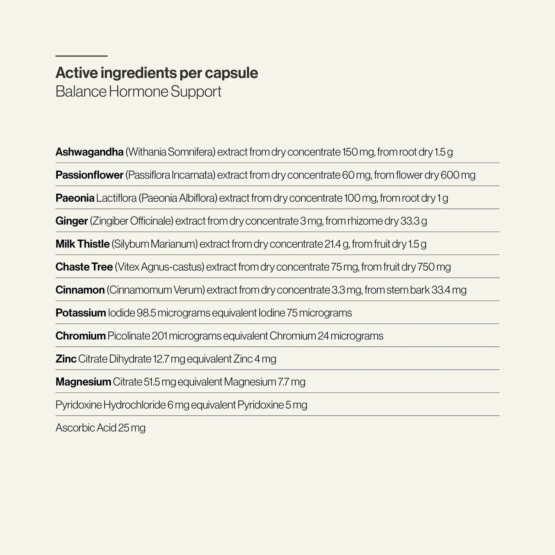 Withania somnifera (Ashwagandha) ext. dry conc. 150 mg, from root dry 1.5 g. Passiflora incarnata (Passionflower) ext. dry conc. 60 mg, from flower dry 600 mg. Paeonia lactiflora (Paeonia albiflora) ext. dry conc. 100 mg, from root dry 1 g, Zingiber officinale (Ginger) ext. dry conc. 3 mg, from rhizome dry 33.3, Silybum marianum (Milk thistle) ext. dry conc. 21.4, from fruit dry 1.5 g. Vitex agnus-castus (Chaste tree) ext. dry conc. 75 mg, from fruit dry 750 mg, Cinnamomum verum (Ceylon cinnamon) ext. dry conc. 3.3 mg, from stem bark 33.4 mg, Potassium iodide 98.5 micrograms equiv. iodine 75 micrograms, Chromium picolinate 201 micrograms equiv. chromium 24 micrograms, Zinc citrate dihydrate 12.7 mg equiv. zinc 4 mg, Magnesium citrate 51.5 mg equiv. magnesium 7.7 mg, Pyridoxine hydrochloride 6 mg equiv. pyridoxine 5 mg, Ascorbic acid 25 mg.