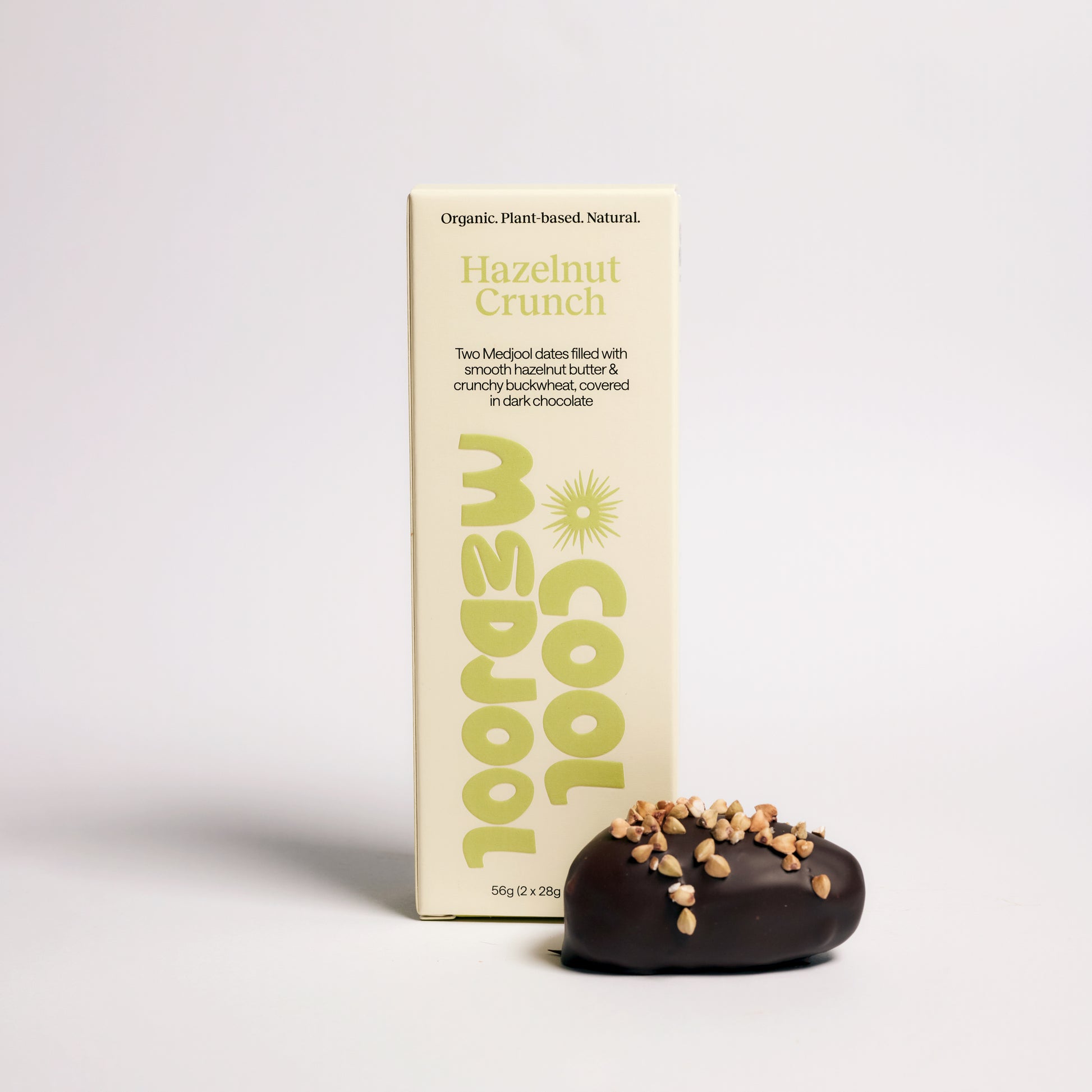 Two individually wrapped Medjool dates filled with smooth hazelnut butter & crunchy buckwheat, covered in our date sweetened dark chocolate.