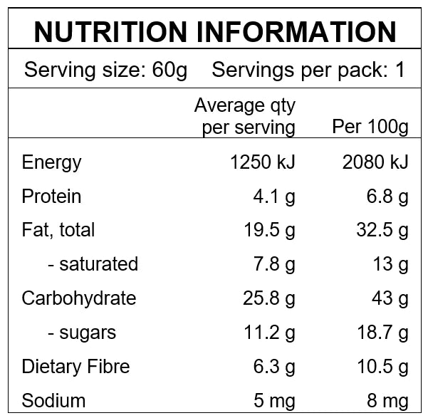 Dark Chocolate 58% (Cocoa Butter*, Raw Sugar*, Cocoa Mass*, Sunflower Lecithin*), HAZELNUT (26%), Brown Rice Flour*, Coconut Oil, Cassava Root Syrup, Coconut Sugar*, Chickpea Flour, Soluble Tapioca Fibre, Tapioca Flour, Natural Flavour, Sea Salt.